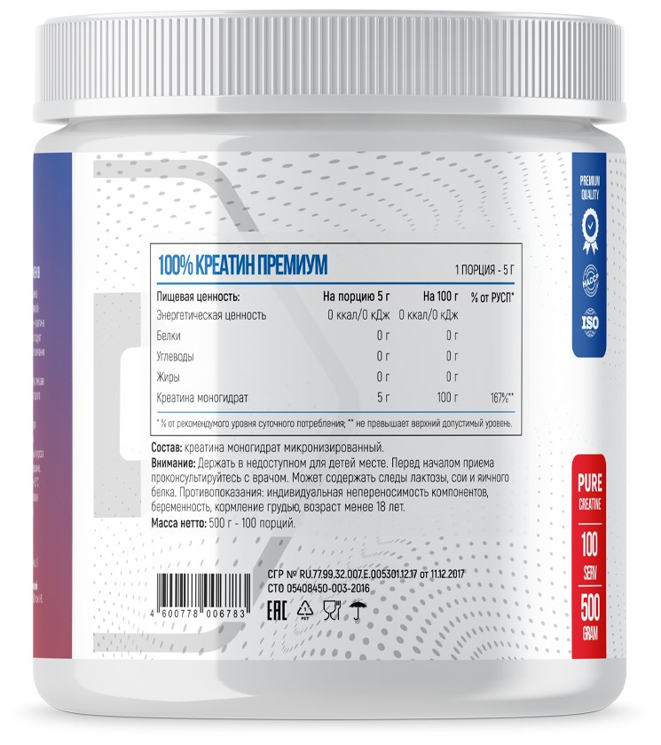 100% Creatine Premium - создан для тех, кто привык получать максимум не переплачивая. В основу добавки положено сырье премиум качества от концерна VitaJoy, прошедшее многоразовую микронизацию. Из каждой порции вы получаете 100% Креатин Моногидрат, лишенный всех сторонних примесей, в легкоусвояемой форме. Он быстро абсорбируется в желудке и дает эффект практически сразу после применения. При этом, добавка проста в приготовлении, максимально безопасна и имеет разумную цену.